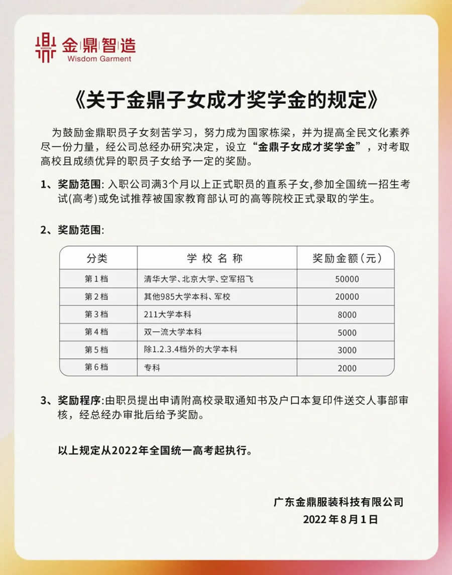 金鼎智造始終堅信,企業的價值不僅體現在產品與服務上,更體現在對員工及其家庭的關懷中。"金鼎子女成才獎學金"的設立,正是這一理念的生動實踐。我們希望通過這份特殊的獎勵,為勤奮好學的員工子女插上夢想的翅膀,在他們人生的重要轉折點上給予溫暖助力。這不僅是對優秀學子的肯定與激勵,更是金鼎智造履行社會責任、傳遞正能量的具體行動。我們期待每一位獲得獎學金的學子都能以此為動力,在求知路上勇攀高峰,將來以真才實學回報家人、造福社會,讓這份關愛持續傳遞、生生不息。